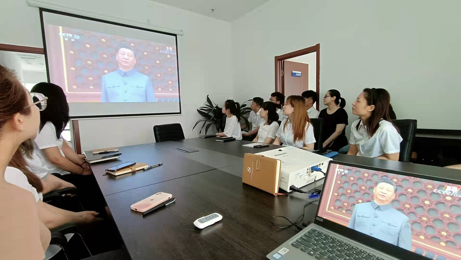 通過大屏幕,看到習(xí)近平黨和國家領(lǐng)導(dǎo)人登上天安門城樓主席臺,看到天安門廣場人頭攢動時,大家目不轉(zhuǎn)睛、聚精會神、認(rèn)真收看。電視直播期間,認(rèn)真聆聽習(xí)近平總書記的重要講話,邊看邊記筆記,總書記振奮人心的講話,會議室不時響起掌聲。一小時四十分鐘的直播,大家始終沉浸在熱烈莊重、恢宏磅礴的慶祝氛圍之中。大家紛紛認(rèn)為,百年恰是風(fēng)華正茂,未來仍需風(fēng)雨兼程,站在新的歷史起點上,更須不忘初心,砥礪前行。